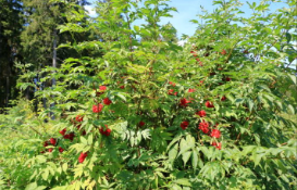 마가목은 장미과 낙엽소교목으로 높이 8m 이상 자라는 나무입니다. 꽃은 5~6월에 가지 끝에 복산방꽃차례를 이루며 흰색으로 피고 열매는 둥글며 9~10월에 붉은색으로 익습니다. 한방에서는 열매와 나무껍질을 약용하는데 가을에 채취하여 햇볕에 말려서 씁니다. 맛은 맵고 쓰며 성질은 따뜻하고 폐결핵, 기관지염, 위염, 복통, 비타민A결핍증, 기침, 기관지염, 류마티스관절염 등에 쓰입니다.