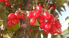 산수유는 층층나무과의 낙엽교목인 산수유나무의 열매입니다. 가을에 붉게 익는 열매로서 타원형의 핵과(核果)이며 처음에는 녹색이었다가 8~10월에 붉게 익으며. 종자는 긴 타원형이며 능선이 있고 약간의 단맛과 함께 떫고 강한 신맛이 납니다. 10월 중순의 상강 이후에 수확하는데 육질과 씨앗을 분리하여 육질은 술과 차 및 한약의 재료로 사용한다고 합니다.